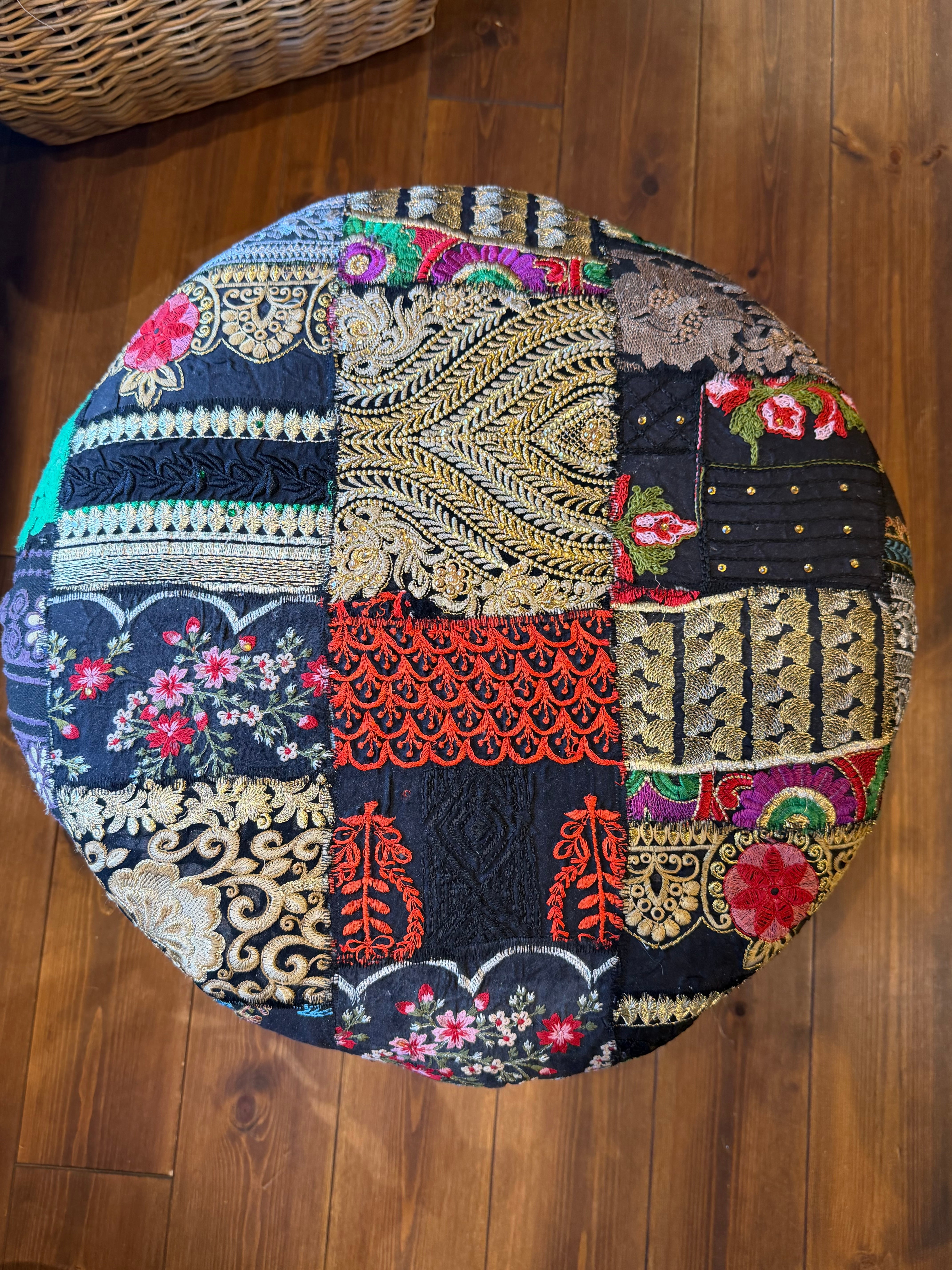 着られなくなったドレスなどの刺繍部分をパッチワークにして仕立てたカラフルなスツールはお部屋に置くだけで雰囲気抜群のアイテム。同じものは一つもない一点もので愛着のわくアイテムです。見た目の可愛さだけでなく座面が広く低めなので日本人には特に落ち着いて座れる高さで実用性もあります。