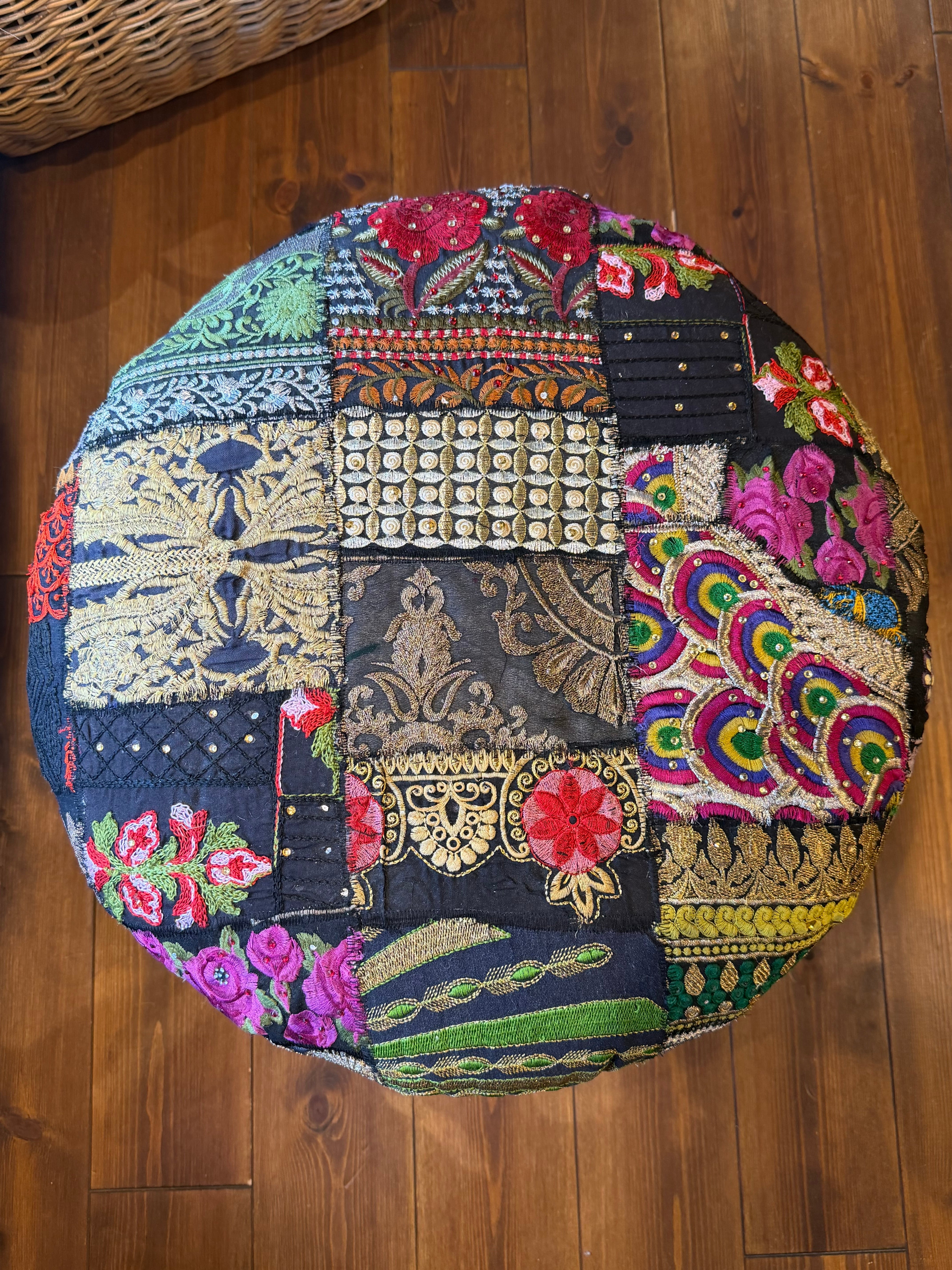 着られなくなったドレスなどの刺繍部分をパッチワークにして仕立てたカラフルなスツールはお部屋に置くだけで雰囲気抜群のアイテム。同じものは一つもない一点もので愛着のわくアイテムです。見た目の可愛さだけでなく座面が広く低めなので日本人には特に落ち着いて座れる高さで実用性もあります。