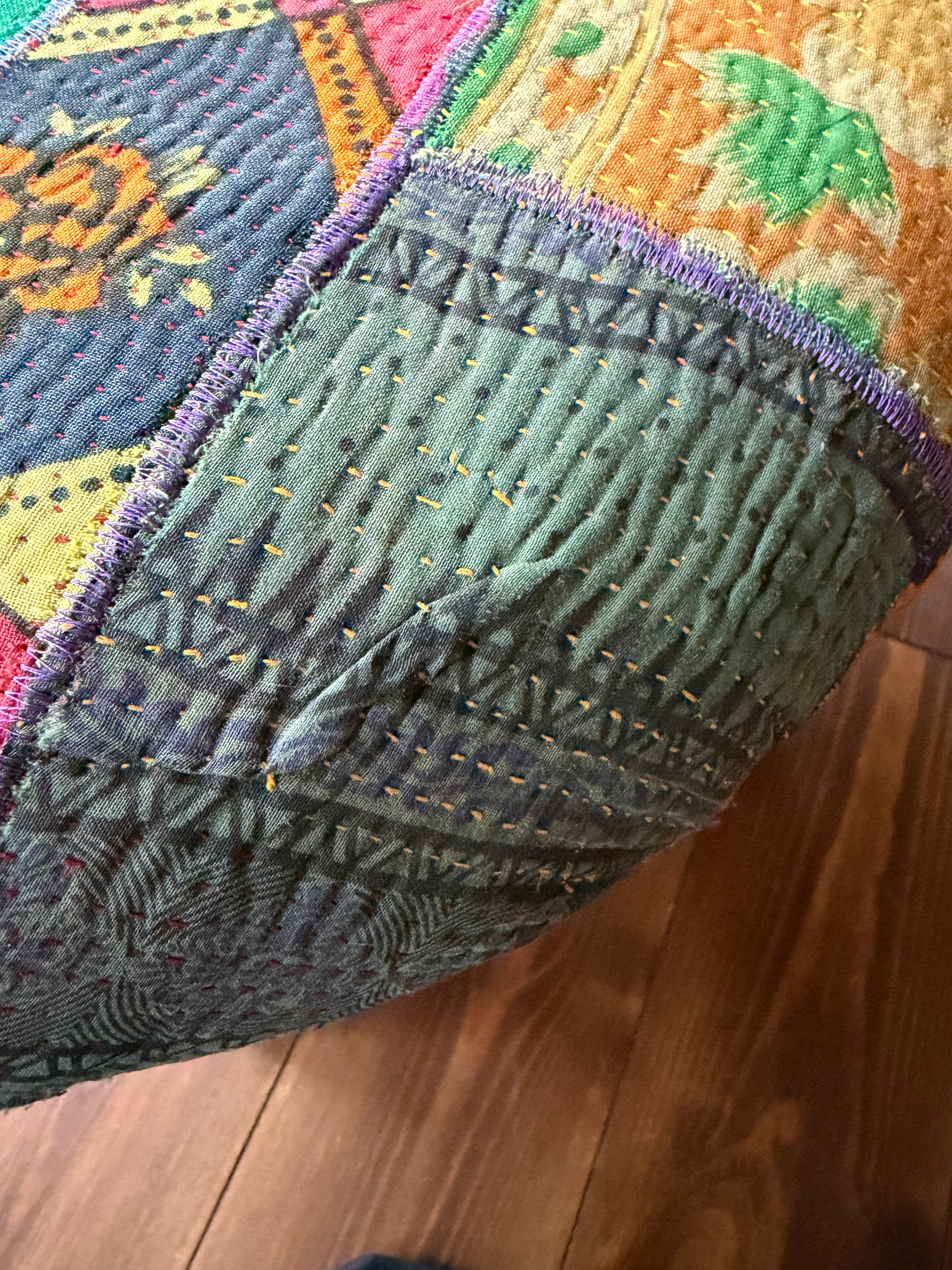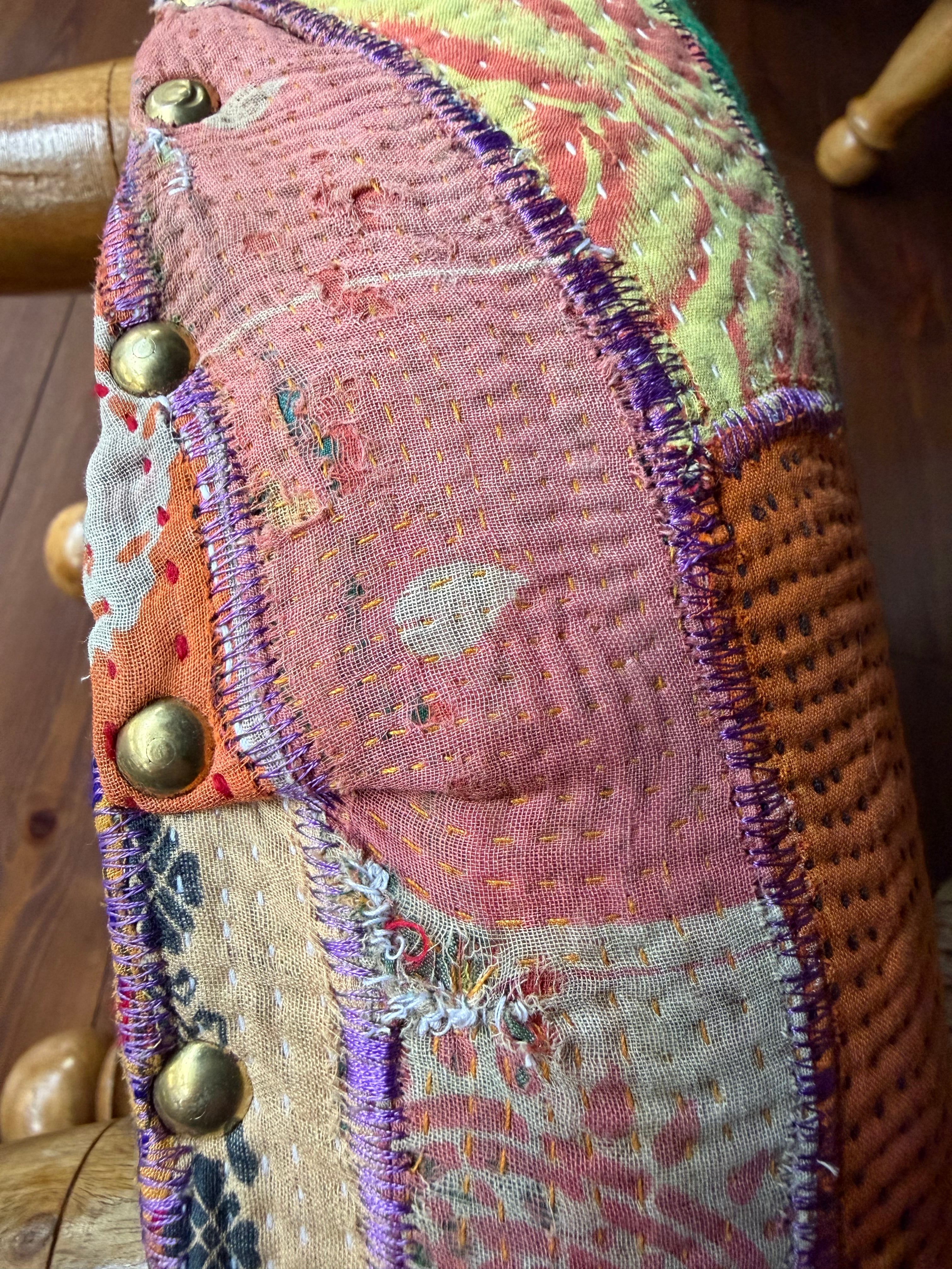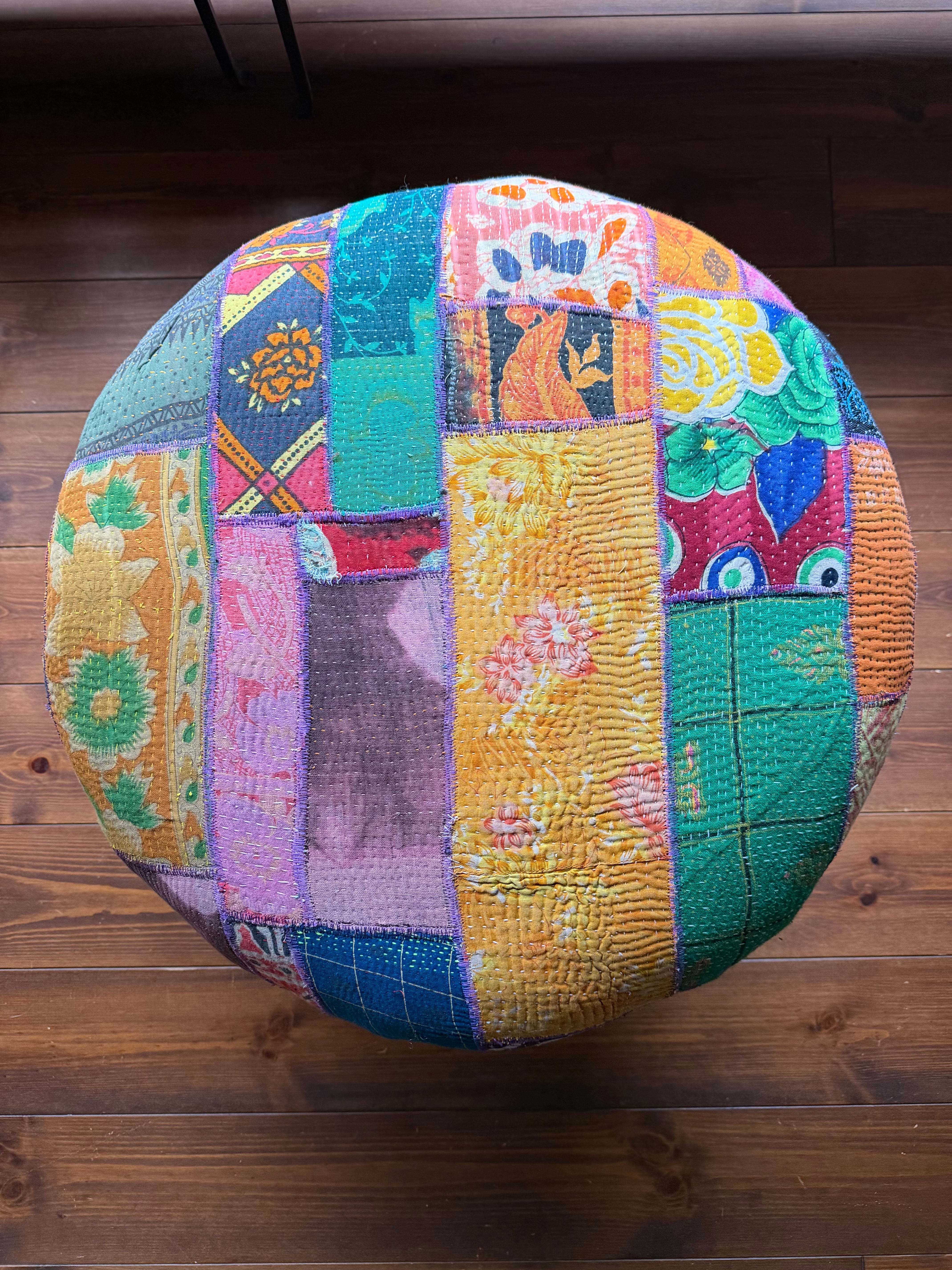 肌触りの良い柔らかなコットン生地に細やかに施された刺し子とカラフルな色柄の配色でお部屋を彩ります。お部屋に置くだけで雰囲気抜群のアイテム。同じものは一つもない一点もので愛着のわくアイテムです。見た目の可愛さだけでなく座面が広く低めなので日本人には特に落ち着いて座れる高さで実用性もあります。