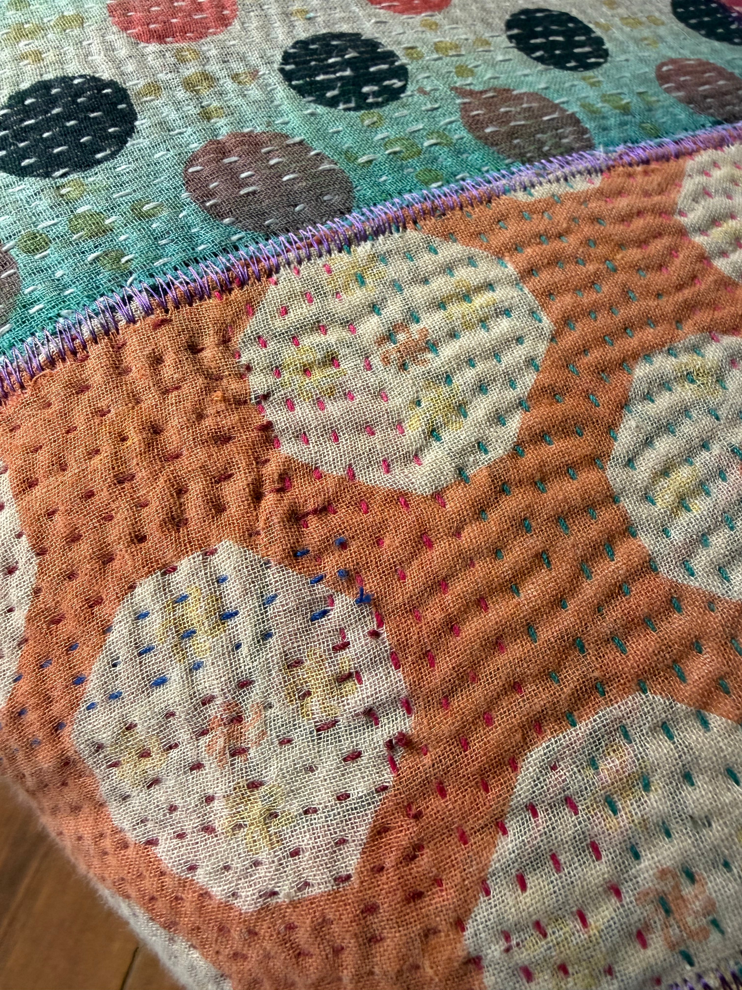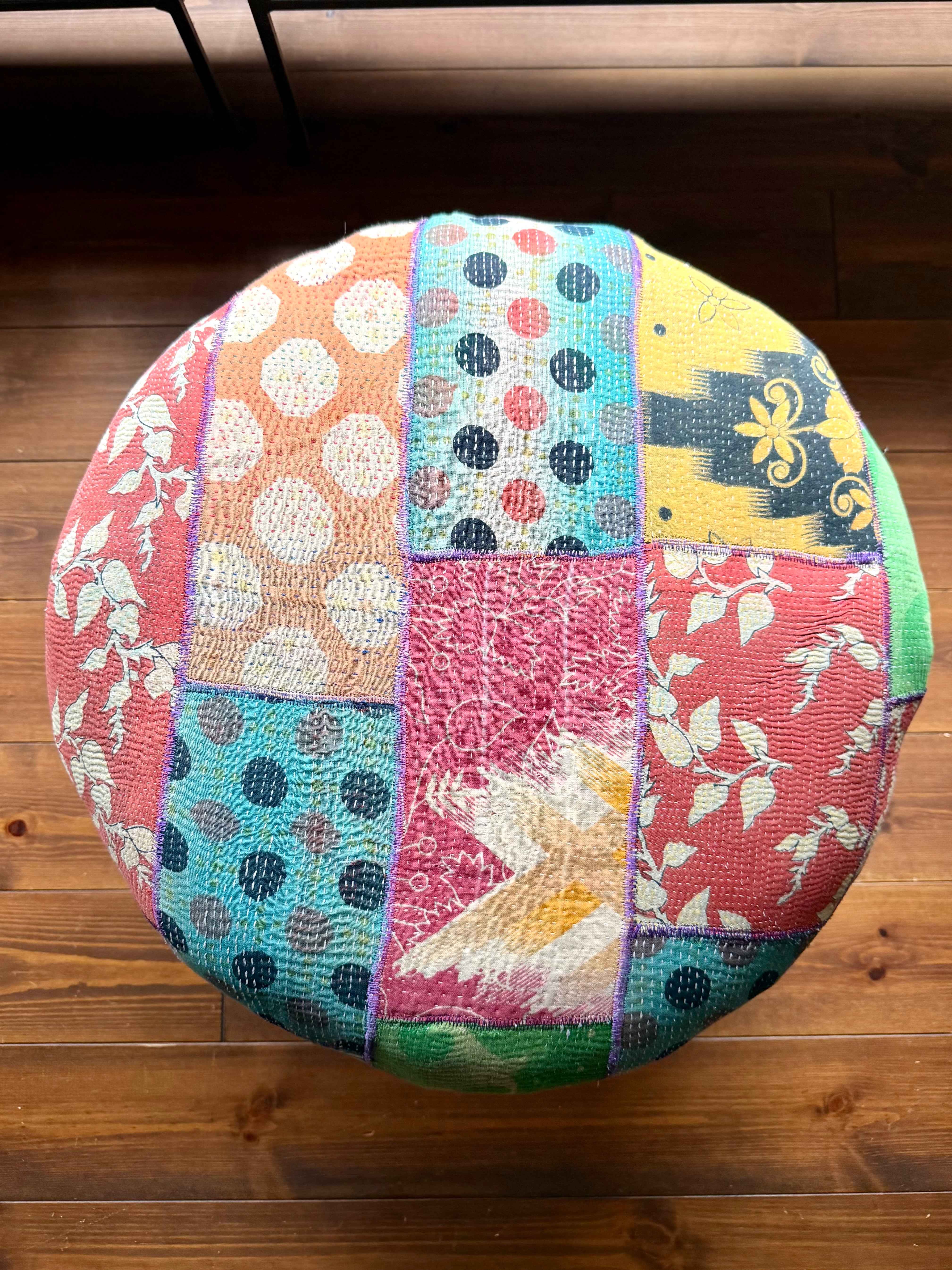 肌触りの良い柔らかなコットン生地に細やかに施された刺し子とカラフルな色柄の配色でお部屋を彩ります。お部屋に置くだけで雰囲気抜群のアイテム。同じものは一つもない一点もので愛着のわくアイテムです。見た目の可愛さだけでなく座面が広く低めなので日本人には特に落ち着いて座れる高さで実用性もあります。