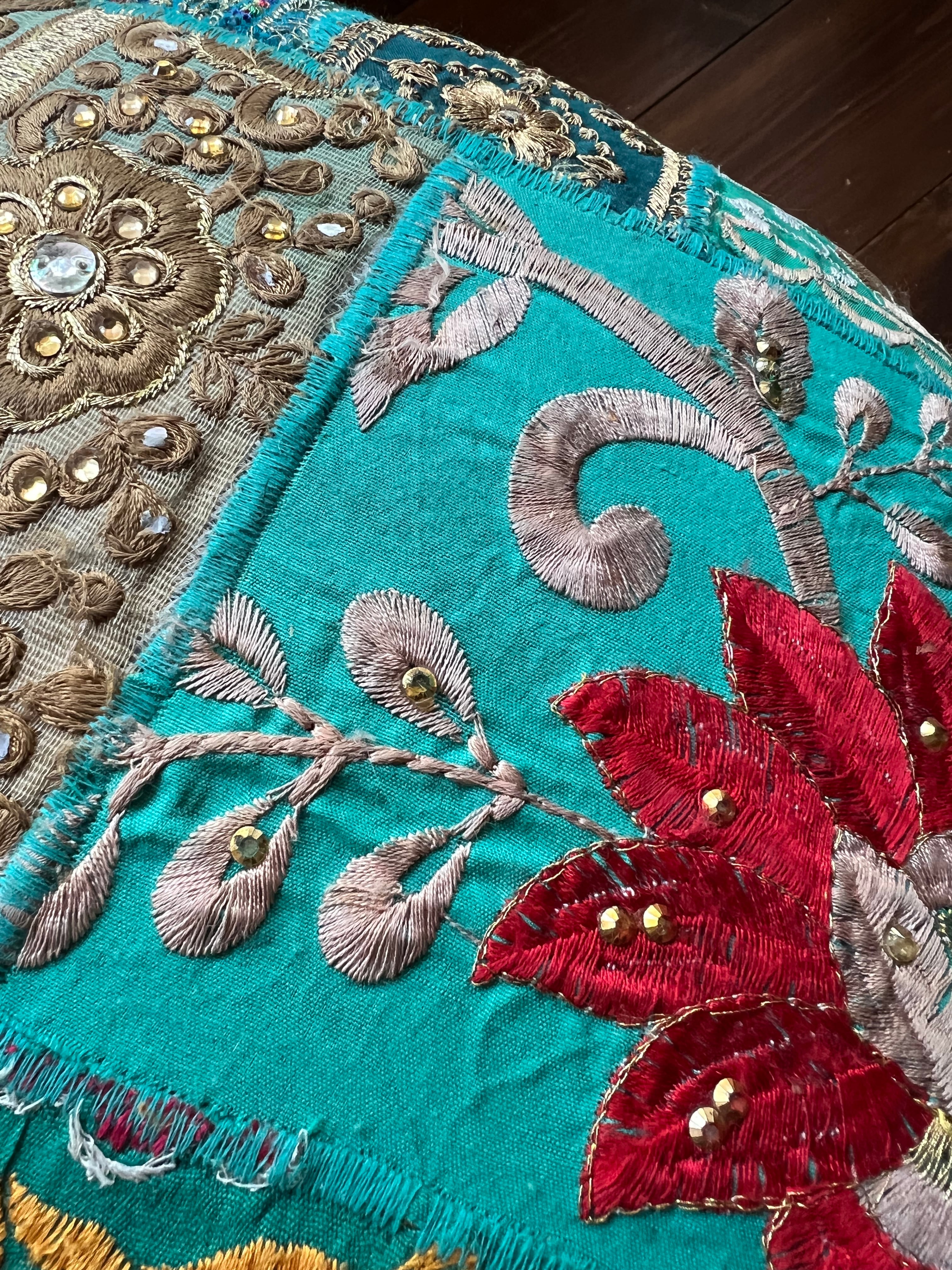 着られなくなったドレスなどの刺繍部分をパッチワークにして仕立てたカラフルなスツールはお部屋に置くだけで雰囲気抜群のアイテム。同じものは一つもない一点もので愛着のわくアイテムです。見た目の可愛さだけでなく座面が広く低めなので日本人には特に落ち着いて座れる高さで実用性もあります。
